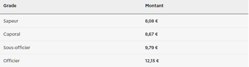 A propos de la rémunération, les SPV, contrairement aux SPP (sapeurs-pompiers professionnel) ne sont pas rémunérés mais indemnisés. Leur indemnisation varie selon le grade du volontaire. Voici une échelle de l’indemnité horaire que peut recevoir le volontaire (source: service-public.fr) :