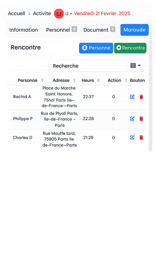 Effectuez le suivi des personnes rencontrées en maraude Retrouvez les personnes rencontrées et notez les actions effectuées