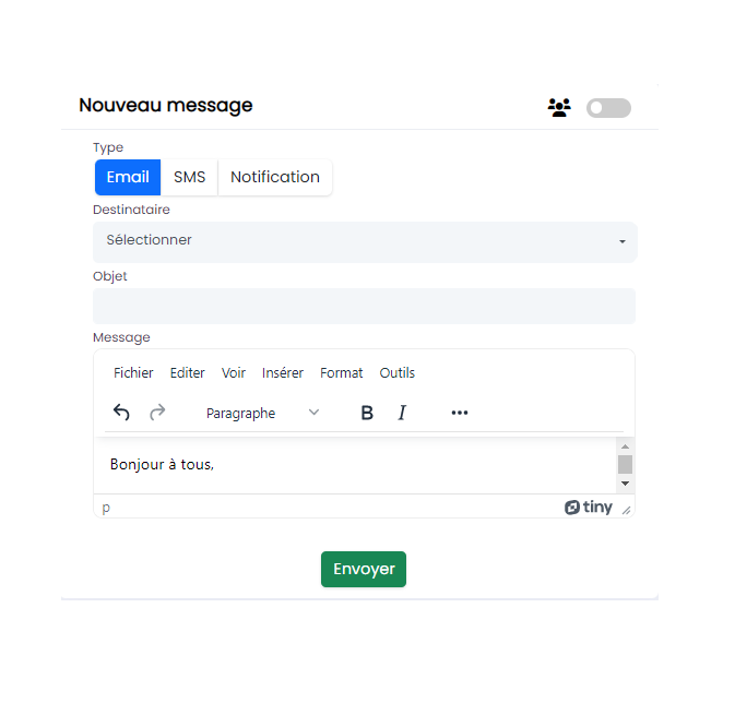 Message groupé facile : simplifiez la communication interne de votre organisation. Filtrez et sélectionnez facilement les destinataires de vos messages groupés